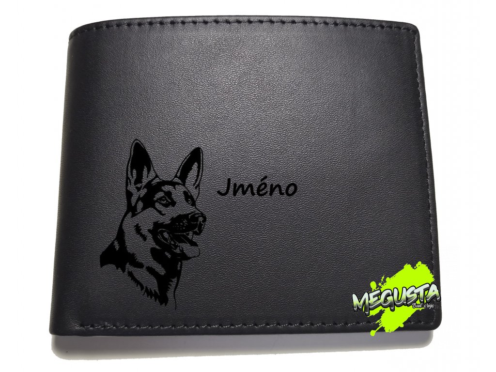 Černá kožená peněženka se psem Německý ovčák - volitelné jméno psa