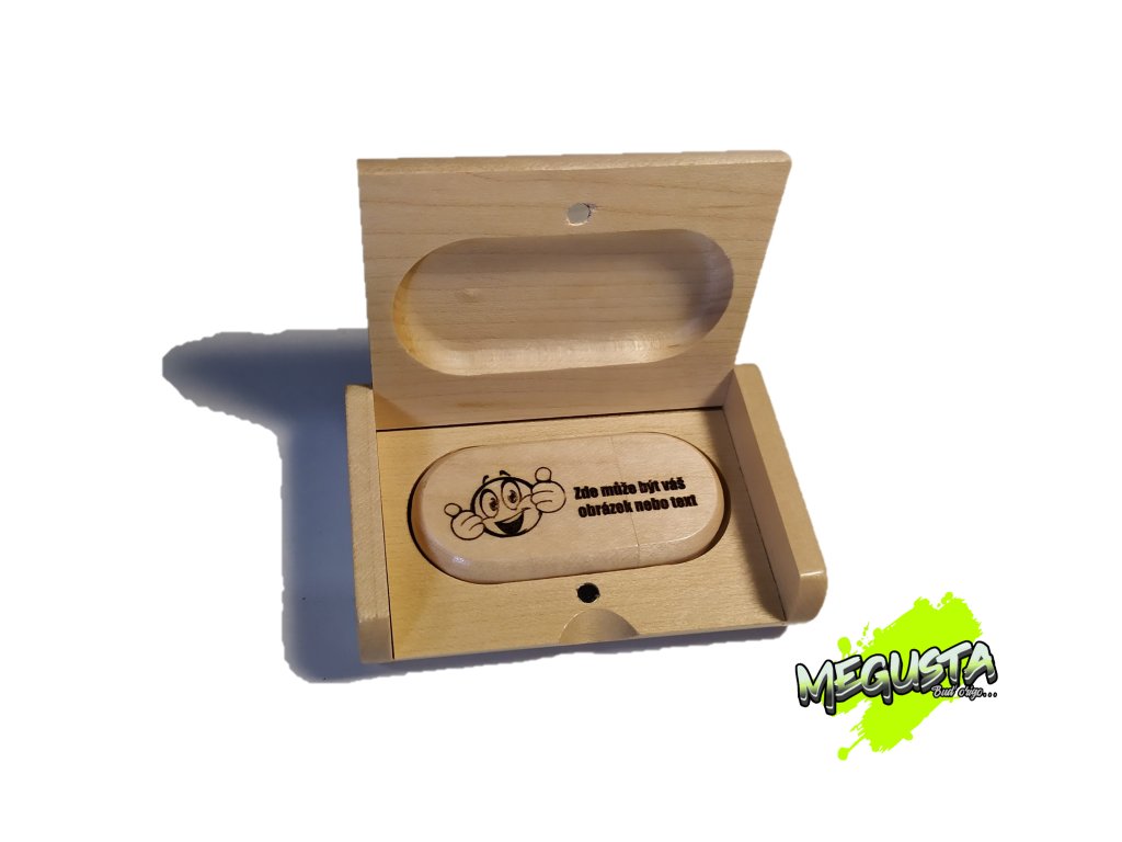 Flash disk v dřevěném provedení o kapacitě 32GB s víčkem na magnetickém zavíraní, disk je v dřevěné zavírací krabičce.