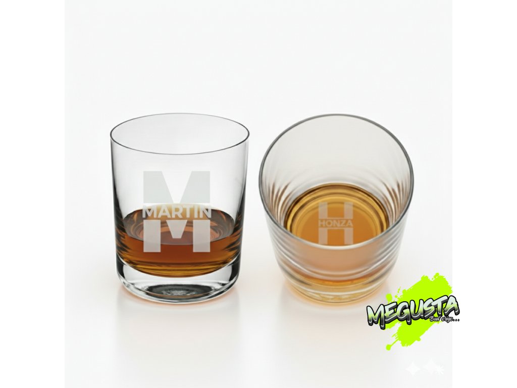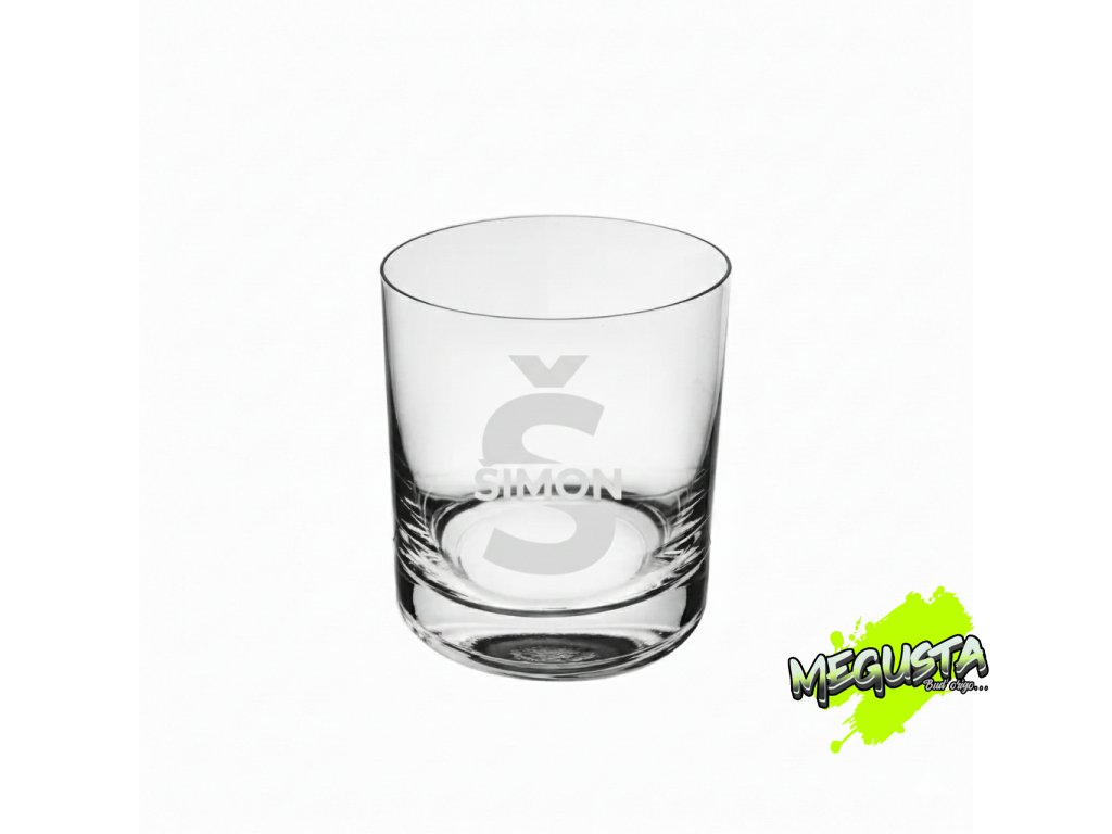 - Sklenice je zdobena designem, kde dominuje velký monogram (např. H, M, Š) a uprostřed je vygravírované jméno (např. HONZA, MARTIN, ŠIMON).